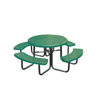 The 358 is a 46" table with 1-5/8" walk through design frame. Umbrella hole is standard. The 358 table with capri seats offers comfortable bench-style seating The 46" round table top and seat planking is thermoplastic coated steel with a diamon... Read more
