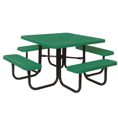 The 358 is a 46" table with 1-5/8" walk through design frame. Umbrella hole is standard. The 358 table with Capri seats offers comfortable bench-style seating The tabletop is a 46" square with thermoplastic coating on all the planking The fram... Read more