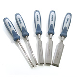 Set of 5 wood chisels with case. 11-in, wood chisels. Chrome vanadium steel blades (1/4 in., 1/2 in., 3/4 in., 1 in. and 1 1/4 in.). Comfort grip handle.