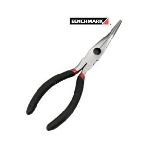 Pliers Bent Nose Pliers CRV/drop forged Black nickel finish Black/red double dip handle Cushion grip Benchmark logo etched on the head HRC: 41-48 (body) 52 - 58 (edge) Hardened cutting edge/heavy duty 6"