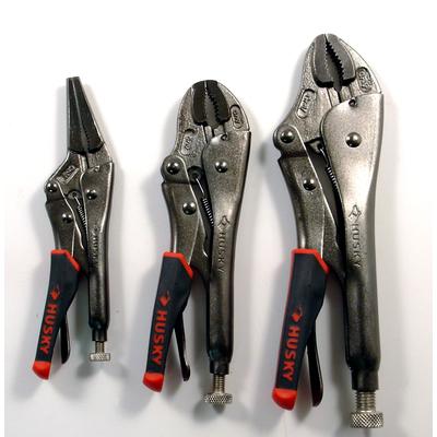 Husky 3 Piece Locking Pliers Set. Jaws of pliers can be locked into position - ideal for tightening, clamping, twisting and turning. Black nickel finish CRV steel Precision milled teeth