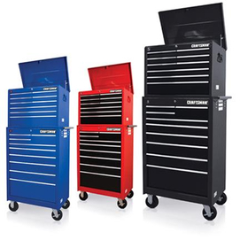 Only at Sears! Ensemble colour - Red Nine drawers on ball-bearing slides Side handle Moves on casters Keyed locks Double-wall steel construction Chest drawers: eight 2" h., one 4 1⁄4" h. Cabinet drawers: three 2" h., two 3" h., three 4 1⁄4... Read more