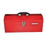 17" (43 cm) red metal tool box features a heavy plated latch designed to withstand weather and weight Removable plastic tote tray Watershed-hinge protects hinge from moisture and dirt Comfort-grip top handle conforms to shape of your hand