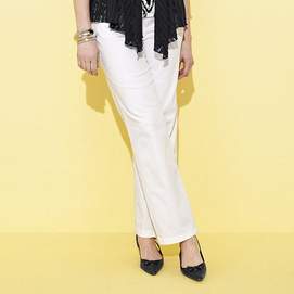 31'' inseam L-shaped pockets and belt loops cotton-polyester-spandex white sit at waist straight leg machine washable