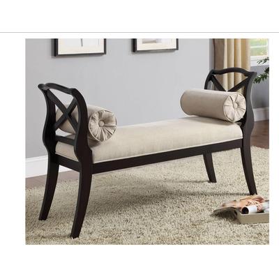 Classic style at its best. This transitional bench has a stylish X on it's side arms. This bench can go in the hallway, living room or bedroom. Made with a neutral toned fabric cushion seat and 2 cylinder shaped pillows. Strong sturdy constructio... Read more