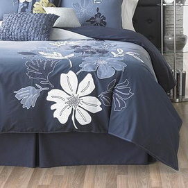 embroidered front with appliqués reverses to solid colour zipper closure double measures 86" w. x 90" l., queen is 92" w. x 94" l., king is 108" w. x 94" l. polyester-cotton with 180 threads per sq. in. machine wash