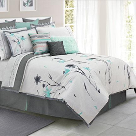 satin ribbon detail on 3 sides with mitered corners reverses to solid zipper closure twin is 68" w. x 90" l., double 86" w. x 90" l., queen 92" w. x 94" l. polyester-cotton machine wash