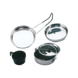 Cookware Backpackers Cook Set The classic 5 piece mess kit is made of stainless steel Includes: 7" (18 cm) frypan, 6.5" ( 16cm) plate which doubles as lid, 5.5" (14cm) saucepan with lid, 3.5" (9cm) mug