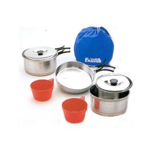2 Person Cook Set Polished stainless steel with copper bottom and folding handles Comprises of 6" (15cm) frypan 1.4 L pot with lid 1L pot with lid 2 plastic cups Carry bag