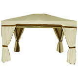 Sun shelter. 10 ft. x 12 ft. Made of aluminum. Roof and curtains made of polyester. Nylon netting. Protects against sun. Includes mosquito net and privacy curtains. Beige and brown. 1-year warranty.