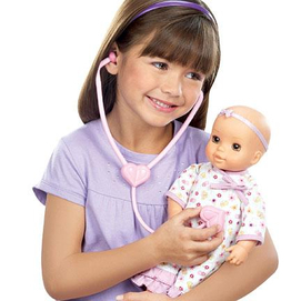 listen to her heartbeat with the stethoscope press her tummy and she laughs, press her back and she cries, and much more comes with thermometer, stethoscope and special spoon batteries included 13" h. ages 3 years and up