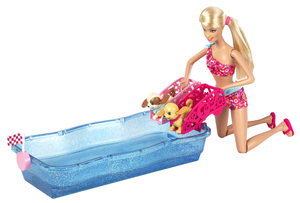 Girls can wind up the puppies' ears and set them up on the slides where Barbie® doll, wearing her cute one-shoulder bikini, can start them off with activation of the mechanism in her back. Once they hit the water, the puppies are off! The poo... Read more