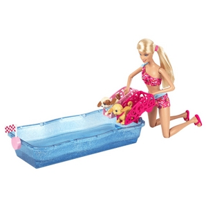 Fashion Dolls Barbie doll's puppies really swim, and they love to see who is the fastest Wind up the puppies' ears and set them up on the slides Barbie doll, wearing her cute one-shoulder bikini, can start the puppy race with activation of th... Read more