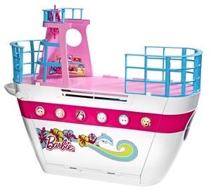 On the “water,” the boat features a steering wheel and space for two lounge chairs on the upper deck. When the boat docks, the side panel opens up to reveal another deck, an umbrella pops up, and a fun swing that fits all four sisters flips out an... Read more