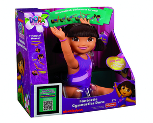 Fantastic Gymnastics Dora is ready to win the gold with 2 gymnastic routines and 7 unique moves from splits to handstands to back bends, and more! Dora also says over 40 phrases in English and Spanish and sings a special gymnastics song.