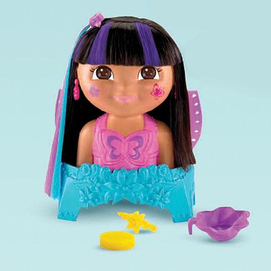 Dora's face, hair and outfit change colour with warm or cold water add hair extensions, barrette and removable earrings to dress up Dora includes butterfly brush ages 3 years & up (2011) Viacom International Inc. All Rights Reserved.