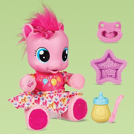 says multiple phrases emits sound effects goes to sleep sits up blinks her eyes 'nuzzles' your child's hand batteries included also includes baby bottle and mouse 'friend' ages 3 years and up