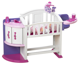 This nursery has everything you need including a crib, storage shelf and cupboard, a feeding chair and even a sink. The set also includes a mobile with colorful character decals, a fork, spoon, plate, sippy cup and play baby powder dispenser.